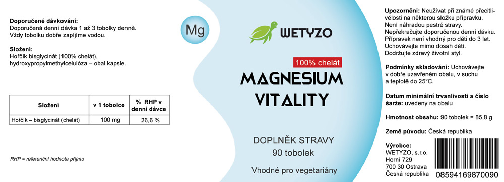 Magnesium Vitality je doplněk stravy s hořčíkem ve formě chelátu. Hořčík ve formě chelátů má vynikající vstřebatelnost a podílí se také na řadě biochemických reakcí v těle.