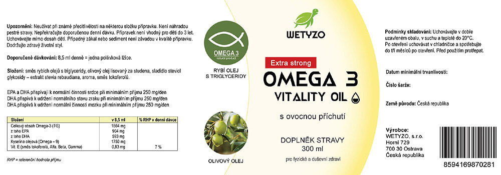 Složení: směs rybích olejů s triglyceridy, olivový olej lisovaný za studena, směs tokoferolů, přírodní ovocné aroma.