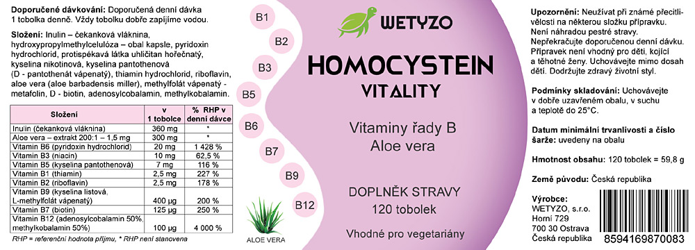Homocystein Vitality s aloe vera je doplněk stravy vytvořený na základě spolupráce s MUDr. Karlem Erbenem a Mgr. Michaelou Verde Beitlovou, který díky vitamínům B6, B9, B12 přispívá k normálnímu metabolismu homocysteinu.