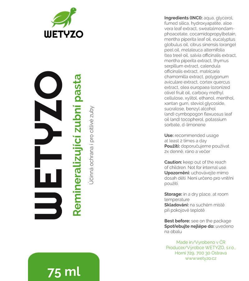 Zubní pasta Wetyzo oživí Váš úsměv díky kombinaci aktivního kyslíku, 4 druhů přírodních esenciálních olejů a 7 druhů bylinných extraktů. Pasta je vytvořena z přírodních složek a neobsahuje agresivní chemikálie.